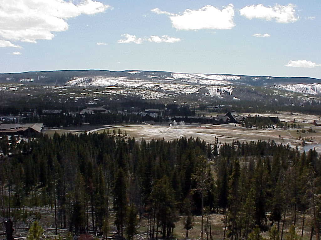 Old Faithful Geyser as seem from Obeservation Point (about 150 feet higher in elevation).