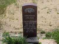 ![]() Marker is for Sans Arc Lakota Cankuhanska (Long Road). Since 1999, this is one of the three markers placed where Indian warriors fell during the fighting. Long Road made it to within a few yards of Benteen's men before he was killed. The coins are part of some of the "offerings" that Indians have left. This is a custom I saw at many monuments to American Indians. Click here to see a website about the dedication of this marker. |