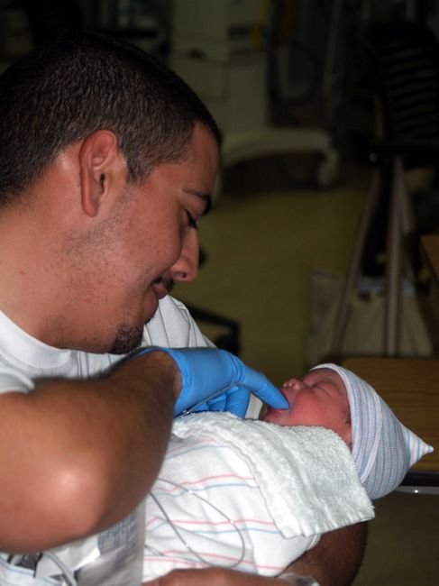 Vincent is feeding her. Note the tiny tube attached to his right finger. This is to get the baby used to feeding off of something about the same size as a nipple.