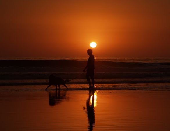 Unidentified man and his dog, and the sunset on San Elijo beach in Cardiff-by-the-Sea, California - September 2, 2007