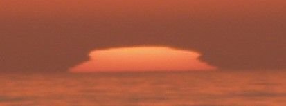 The sun is deformed as it sets into the distant clouds.
