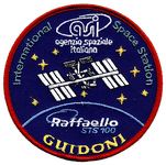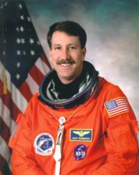Astronauts entering their ground transportation van. The man with the goatee is Umberto Guidoni. Immediately behind him is Kent Rominger. Facing you with his arm up waving is Scott Parazynski. The head next to Scott's is John L. Phillips. Next to him is Chris Hadfield. Entering the van are Yuri Lonchakov and Jeffrey Ashby