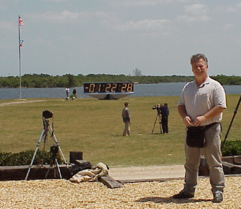 Me next to the countdown clock. The Shuttle is in the distance just above and to the right of the 8 on the clock.