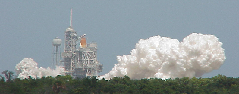 Right on time, the Shuttle took off. NASA pumps thousands of gallons of water into the area under the launch pad. This keeps the area cooler and it helps to dampen the roar of the rockets. When the flames of the rockets hit this water, it generates steam. This steam forms much of the clouds you see at a launch.