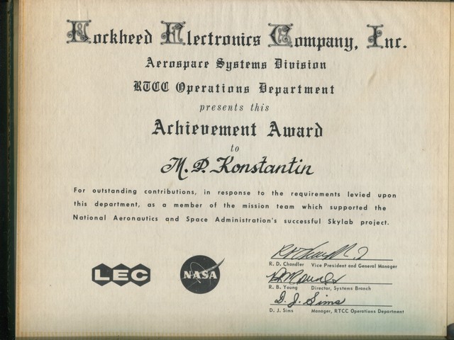 A copy of the Commendation I received for my work on the Skylab Missions.