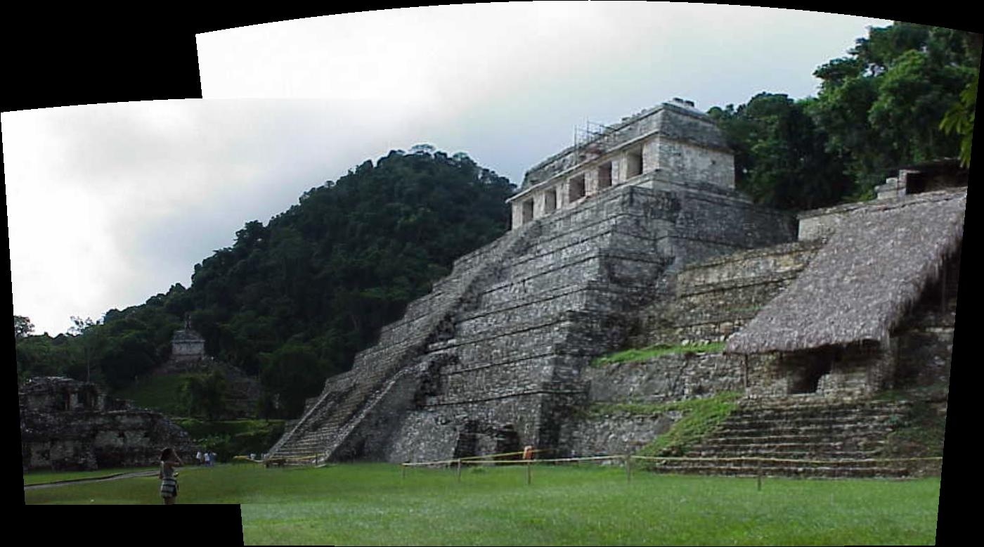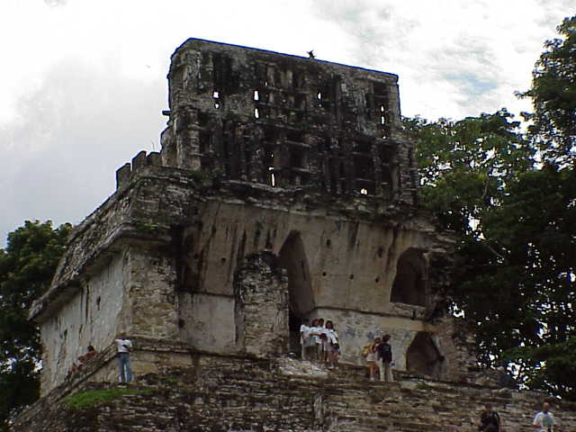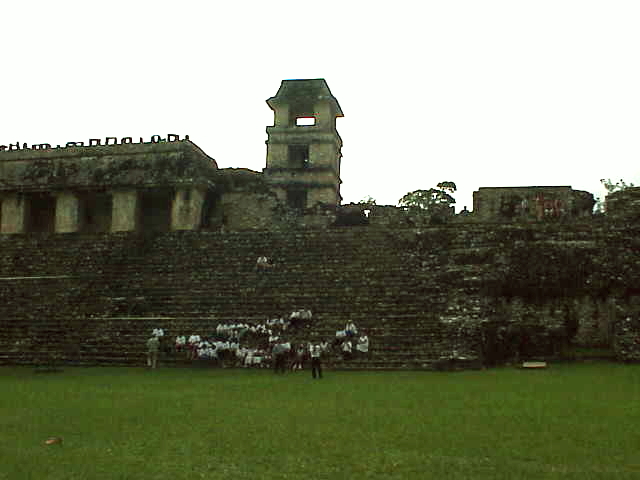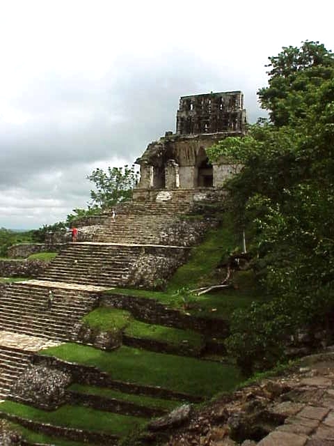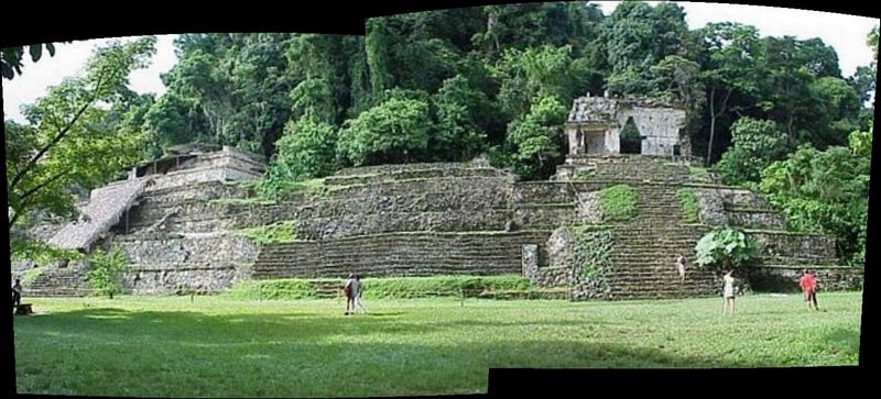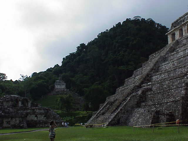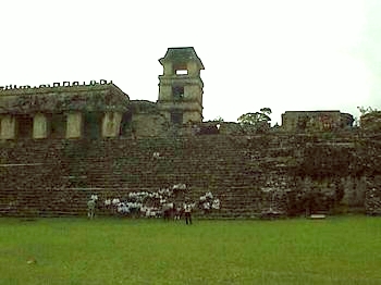 To the right is the east end of the Temple of the Inscriptions. In the center is the Temple of the Sun. To the left is south end of the Palacio.