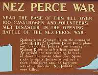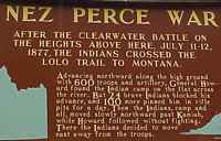 ![]() The sign says: "Near the base of this hill, more than 100 cavalrymen and volunteers met disaster in the opening battle of the Nez Perce War. Rushing from Grangeville on the evening of June 16, 1877, Captain David Perry planned to stop the Indians from crossing the Salmon River to safety. At daylight the next morning, he headed down the ravine below you. Some 60 to 80 Indians wiped out a third of his force and the survivors retired in disorder. No Indians were killed." |