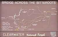 ![]() From the Lewis & Clark journal: "At an early hour we proceeded along the right side of the Kooskooskee, over steep, rocky points of land, till at the distance of four miles we reached an old Indian fishing-place." The sign says: "On their westbound journey, Lewis and Clark crossed here, September 15, 1805, after camping four miles upstream at Powell. Their Shoshoni guide had brought them down an old trail from Lolo Pass to a Lochsa fishery he knew about. To continue west, he had to take them north up this ridge to rejoin their Lolo Trail route. Indian travel through here had to go along high ridges because Lochsa Canyon had too many cliffs and gorges to provide a good horseback route." |