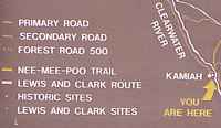 ![]() This is on Highway 12, north of Kamiah. From the Lewis & Clark journal (May 17, 1806): " The Chopunnish are among the most amiable men we have seen. Their character is placid and gentle, rarely moved to passion, yet not often enlivened by gayety." Click here for a NPS site about this area |