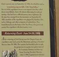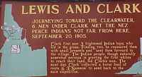 ![]() The elevation here is approximately 3,200 feet. The sign says: "Journeying toward the Clearwater River, six men under William Clark met the Nez Perce Indians not far from here, September 20, 1805. Clark first saw three frightened Indian boys, who hid in the grass. Finding two, he reassured them with small presents and sent them forward to the village. The Indian people, though naturally somewhat nervous in greeting the first whites to reach their land, fed Clark's men. The next day, Clark collected a horse load of roots & 3 Sammon to send back to the main expedition." From the Lewis & Clark journal: "...and at twelve miles distance descended the last of the Rocky mountains [Bitter-root ranges] and reached the level country. A beautiful open plain, partially supplied with pine, now presented itself. He continued for five miles, when he discovered three Indian boys who, on observing the party, ran off and hid themselves in the grass. Captain Clark immediately alighted, and giving his horse and gun to one of the men, went after the boys. He soon relieved their apprehensions, and sent them forward to a village about a mile off, with presents of small pieces of ribbon." |